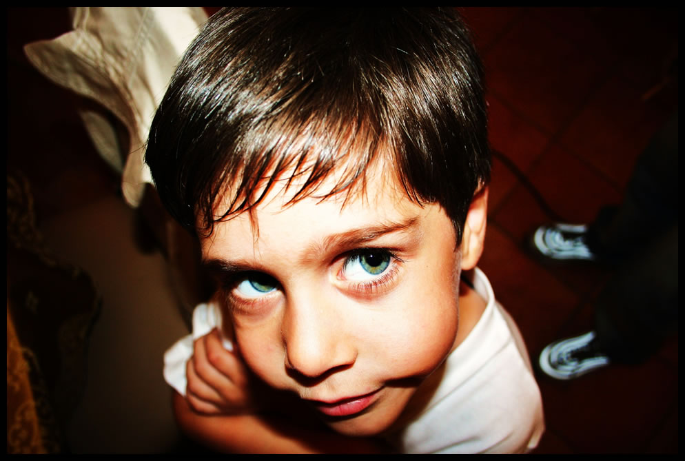 Il punto di ripresa è un forte strumento di espressione. Qui l’inquadratura è dall’alto, a restituirci la prospettiva del nostro sguardo da adulti. Ed è proprio questa la chiave di volta del ritratto che combina con ironia e semplicità, una prospettiva “adulta” da un lato e l’espressione del piccolo Simone che pare in bilico tra divertita impertinenza e sfida.