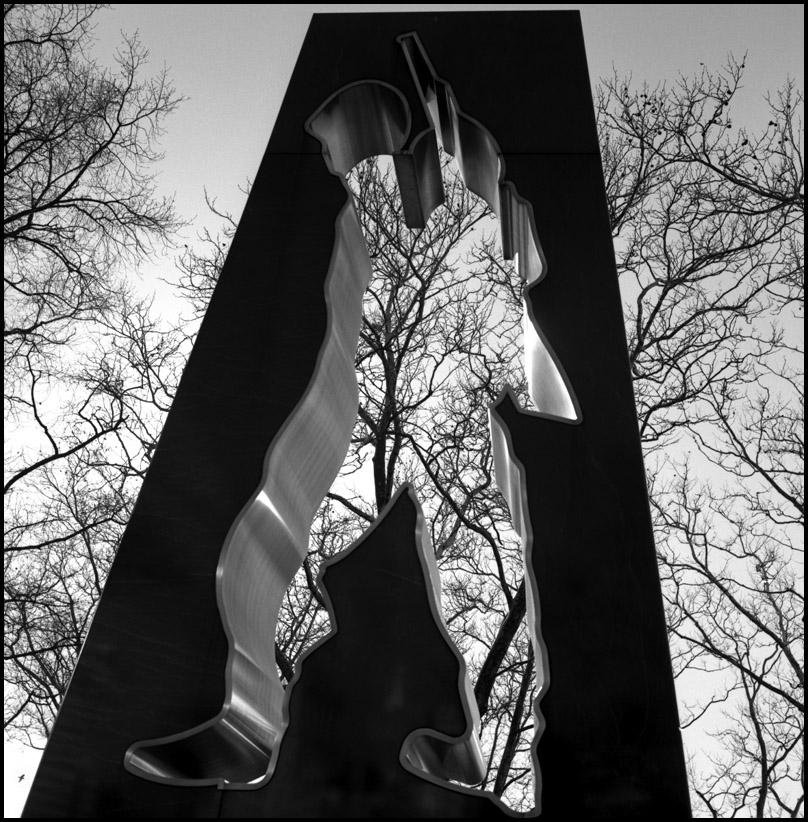Curiosa questa scultura che lascia vedere attraverso di essaun gruppo di alberi spogli, triste come l'idea dei tanti soldati caduti.