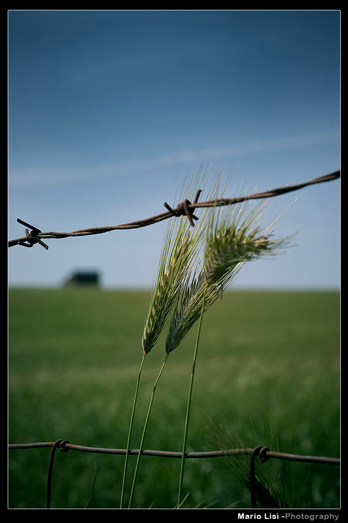 Ben fatta; per il contrasto tra filo spinato e spighe la intitolerei "speranza".