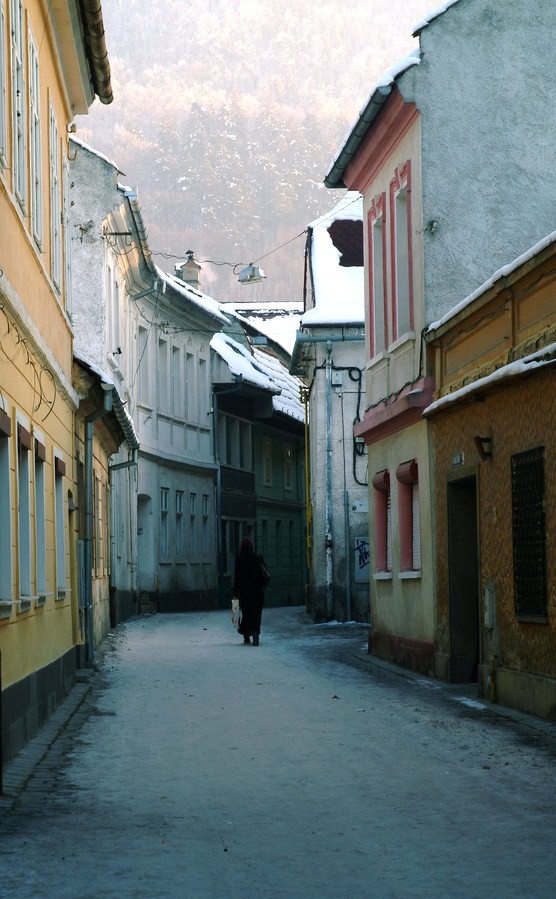 | Passante solitaria in un freddo mattino d'inverno in Transilvania |