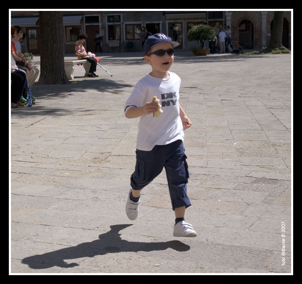 forse l'attimo particolare che hai saputo riprodurre si perde nella piazzola quasi desarta d'estate e il bimbo è troppo vicino...taglierei un pò a destra dove non accade nulla...