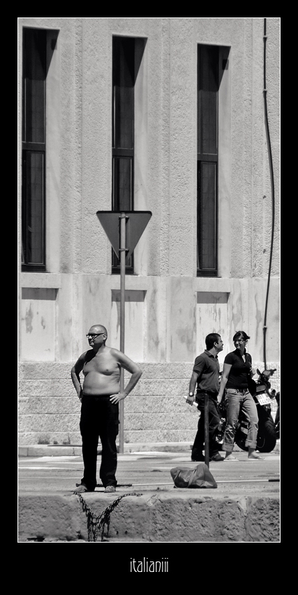 Forse Matteo la vede più come b/n che come street... mi spiego, dal punto di vista del messaggio mi sembra che funzioni alla grande, e mi sembra che abbia decisamente più elementi del racconto che l'altra: l'uomo, la coppia, le finestre. Al punto che il rischio di sovraccarico c'era, me la immagino con solo l'uomo e le finestre (a proposito, quello è puro stile architettonico del periodo fascista, una chicca l'inclusione a formato intero) e la vedo funzionare lo stesso...
