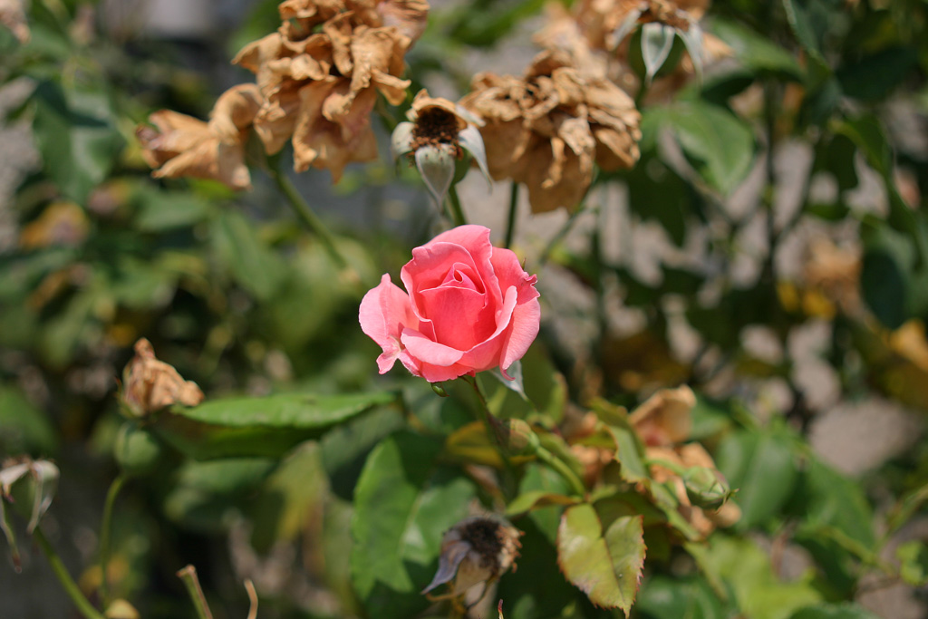 mi piace molto questa rosa in boccio in mezzo alle altre completamente disfatte , bella foto, bel messaggio