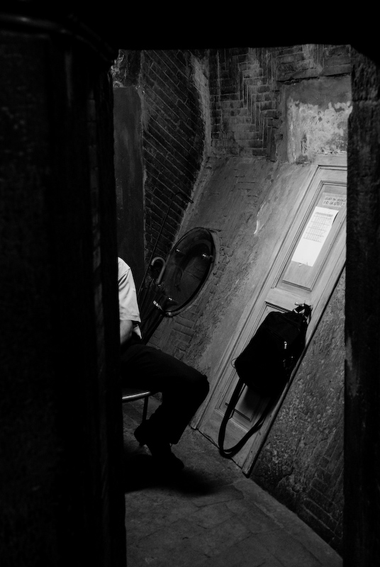 Mi piace fare foto a persone ma non mi piace essere visto perche cambia completamente il momento. Da qui l'idea di non mettermi frontalmente all' uomo. Poi se lo avessi preso nel totale il soggetto diventava lui e non lo volevo perche sarebbe diventato insignificante e banale. Così invece si ha la presenza umana ma è marginale come il suo ruolo in quel momento. Fa parte della scena il suo non essere soggetto ma essere presente.