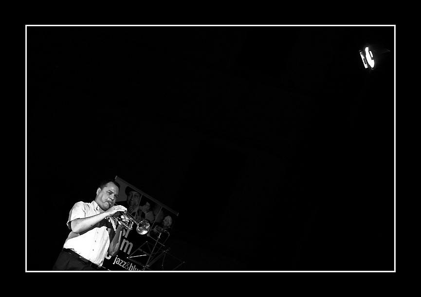 La luce che piove dal faretto in alto sulla destra, segue un percorso “sfacciatamente” diagonale e trae dal nulla la figura di Ron Horton, del suo strumento e del cartellone alle sue spalle. La rotazione imprime un’improvvisa e brusca accelerazione del ritmo di lettura dell’immagine, ...che d’un tratto devia dal percorso della luce e segue quella linea di forza che si sprigiona dall’ottone.