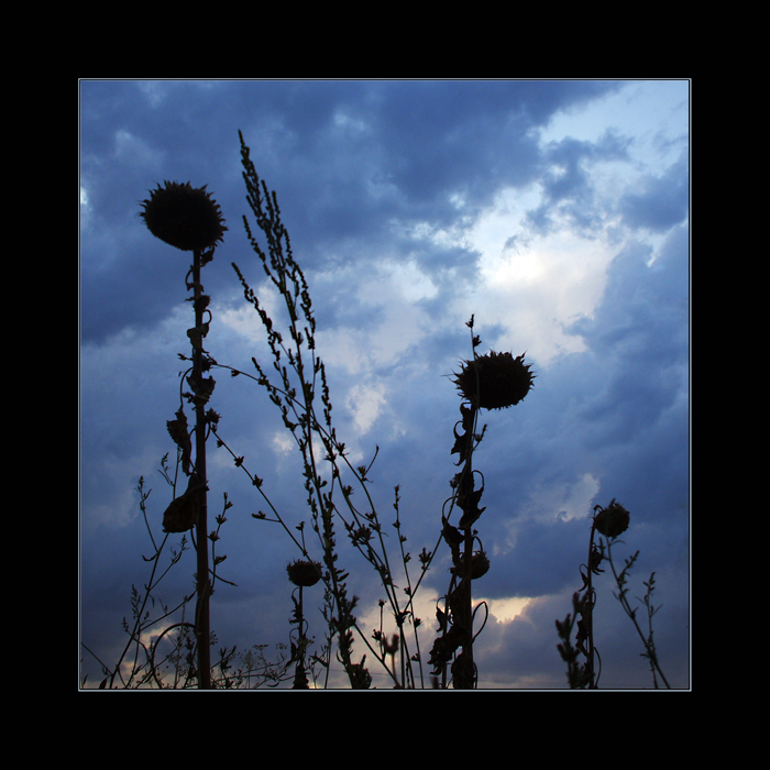 la composizione così, con il taglio quadrato mi piace un sacco... mi piace che hai fatto una bella foto con dei girasoli rinsecchiti e il cielo con questi nuvoloni... è insolito