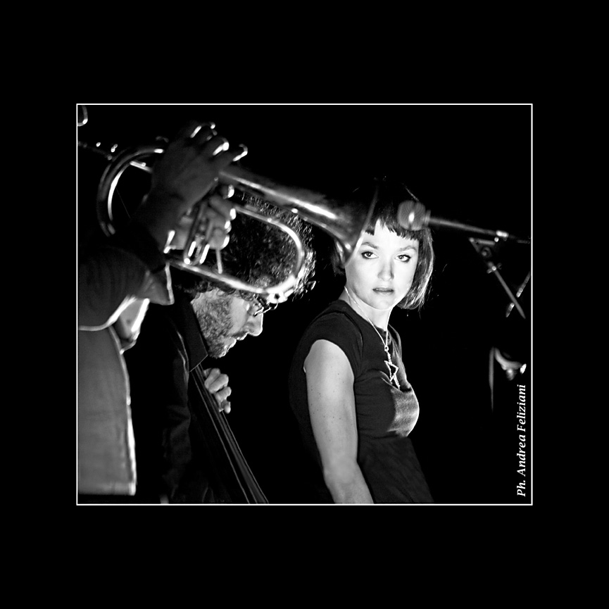 franchino:..era una situazione di luce molto forte che batteva sul volto della Magoni..ero nella posizione giusta e fortunata, concentrato su questo sguardo verso la tromba, che ha eseguito solo un accompagnamento su un pezzo..l'inserimento di Spinetti con il suo contrabbasso per me definisce, riempie, la foto..