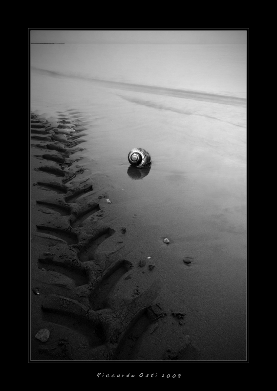 priva di un dinamismo formale, congelato in un tempo e in uno spazio indefinito. Ma ricca, travolgente e quasi ''psichedelica'', con il suo rimando alla natura dell'istante, il carpe diem della fotografia, ma al tempo stesso si fonde con elementi compositivi assolutamente in antitesi con la natura stessa,la lumaca e l'orma di un quad. Si, molto ben costruita Riccardo.