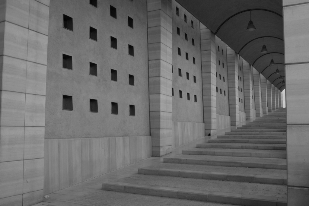 Un paio di cose, non mi convincono molto.. il b/n, non lo vedo all'altezza della situazione geometrica e delle linee che hai catturato.. mi pare un po' troppo grigio, poco graffiante.. proverei a regolare diversamente i livelli e a dare un po' di contrasto..