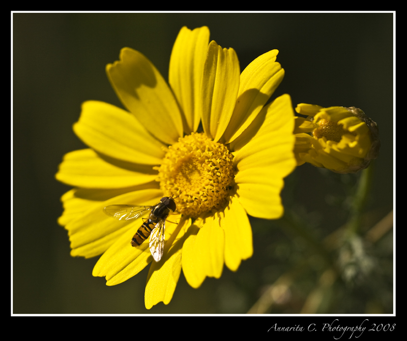 un bel giallo pieno che stacca dallo sfondo, un apetta nitida...insomma la foto colpisce...peccato, come ti hanno gia fatto notare, per la ridotta pdc che lascia parte del fiore fuori fuoco. una curiosità: è stata una scelta voluta o una svista di cui ti sei accorta a posteriori?