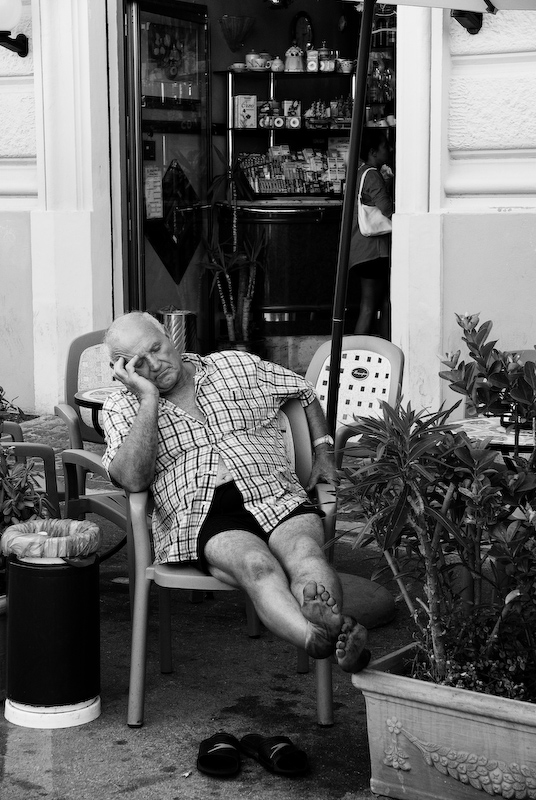 Tipico ritratto ambientato colto al volo (spero!?) e simpatico. Buona l'inquadratura e valida la scelta di avere a fuoco anche lo sfondo (se voluta, o usi una compatta?). peccato per il B/N, a colori sarebbe stata perfetta. _________________ Stregatto |