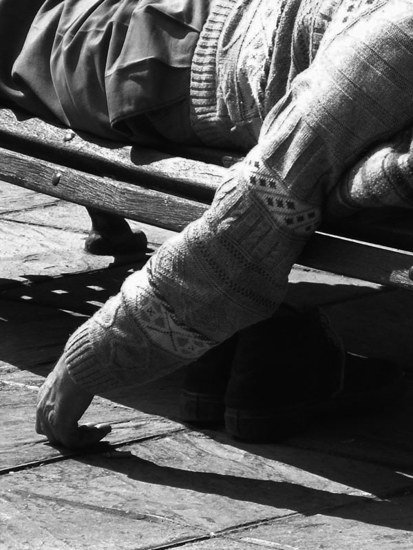 Un uomo dorme su una panchina al sole, si è tolto le scarpe e probabilmente si è addormentato fumando, come la sigaretta a lato della mano lascia pensare...