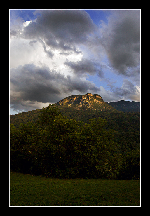 bella la luce che illumina la cima del monte in contrasto con le nuvole nere nel cielo!!
