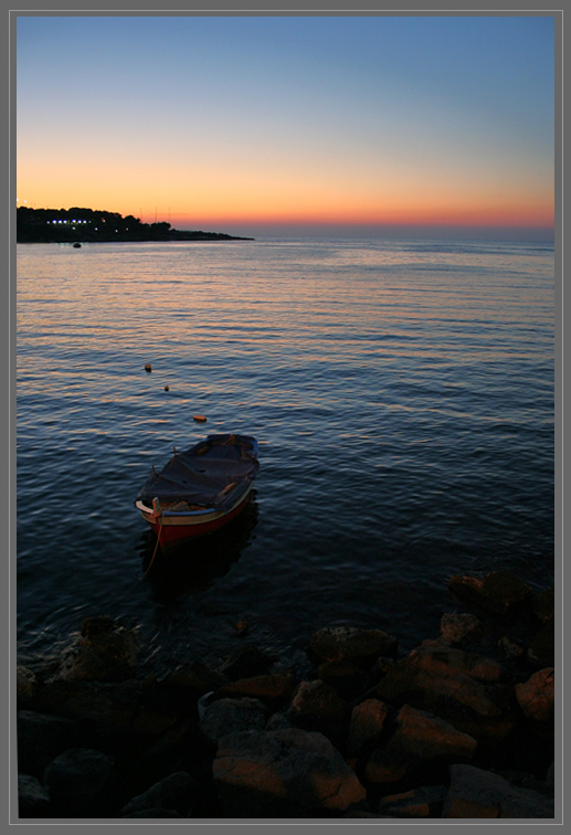 Per il flash... il mio esterno caput... si è rotto! Quello integrato retrattile della macchina... non lo sò non mi soddisfa e poi credo che avrebbe rovinato le tinte tenui del tramonto... anche se da un lato m'avrebbe aiutato a dare all'immagine una generale nitidezza in più visto che scattavo il verticale a mano libera, e magari mi sarei risparmiato quel rumore tra gli scogli e la barchetta.