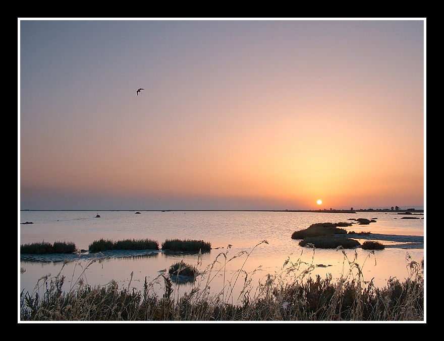 Molto bella anche questa. Curiosamente (non so se era proprio questa la tua intenzione) comunica, almeno a me, un'impressione di gelo invernale, come se la vegetazione secca in primo piano fosse irrigidita dalla brina e lo specchio d'acqua a sinistra fosse ghiacciato. Una magnifica alba invernale (magari è un tramonto estivo, invece). In ogni caso mi piace moltissimo. L'uccello in volo ci sta benissimo in questa luce pallida e perlata del cielo.