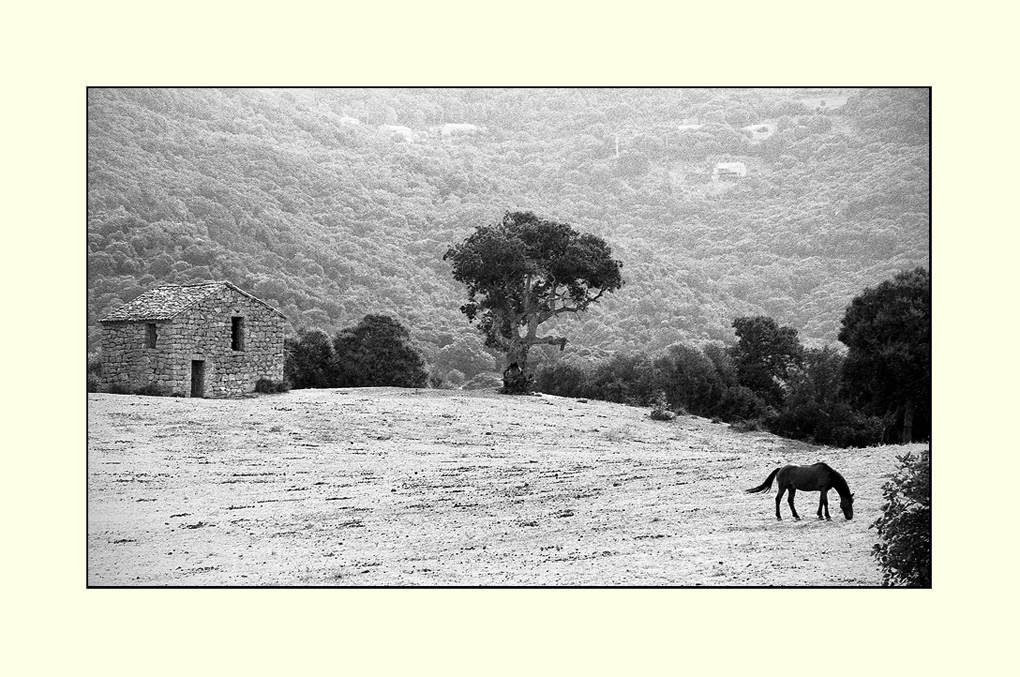 A dir la verità ho scattato in ritardo, sarebbe stato meglio scattare con il cavallo più a sinistra, escludendo il cespuglio e lasciando un pò più d'aria alla casa.