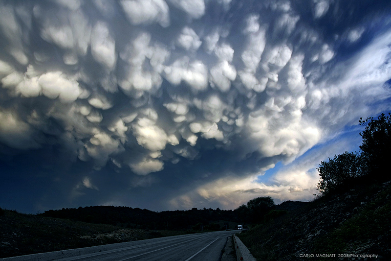 Ero in viaggio per una strada abruzzese ed essere sovrastati da una marea di nuvole come queste è stata una sensazione veramente strana. La foto non rende l'idea dell'atmosfera surreale che ti circondava da ogni lato; mai viste nuvole così... pallose. Ciao e grazie! Carlo.