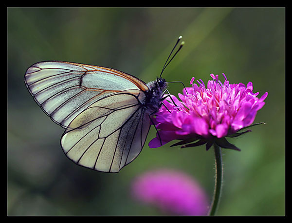 La nitidezza della farfalla è concentrata giustamente sulle ali ed è molto buona; mi piace anche il cromatismo del fiore e come risalta sullo sfondo.