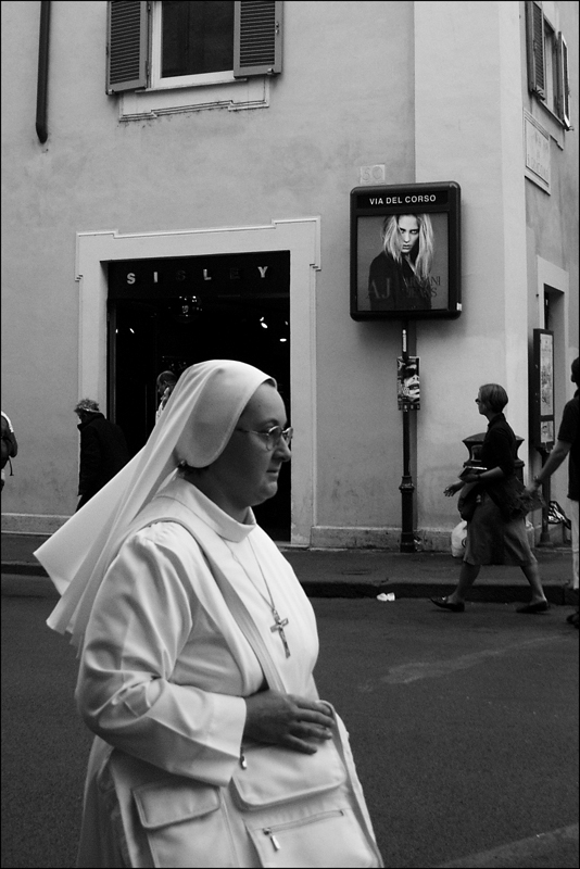 porre sulla stessa diagonale la suora e la donna del cartello è stata davvero una buona idea ai fini della trasmissione concettuale dello scatto: anche l'opposizione cromatica dei vestiti sottolinea la divergenza tra le due figure protagoniste.