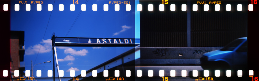 Mi piace molto l'accostamento delle due immagini, che dalla strada a destra, con l'ampio spazio lasciato all'auto che si muove proprio nella direzione del moto, consente di strabordare nel pezzo a sinistra, dove il filo del cemento messo a chiudere la carreggiata continua il suo profilo in quell'elemento metallico con la scritta Astaldi.. che ci porta direttamente sulla strada e ci da' la visione di un pezzo di città..