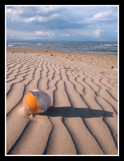La prima cosa che mi è venuta in mente è la stessa di bunjin, cioè di inquadrare solo la sabbia con le sue ondulazioni e la conchiglia.