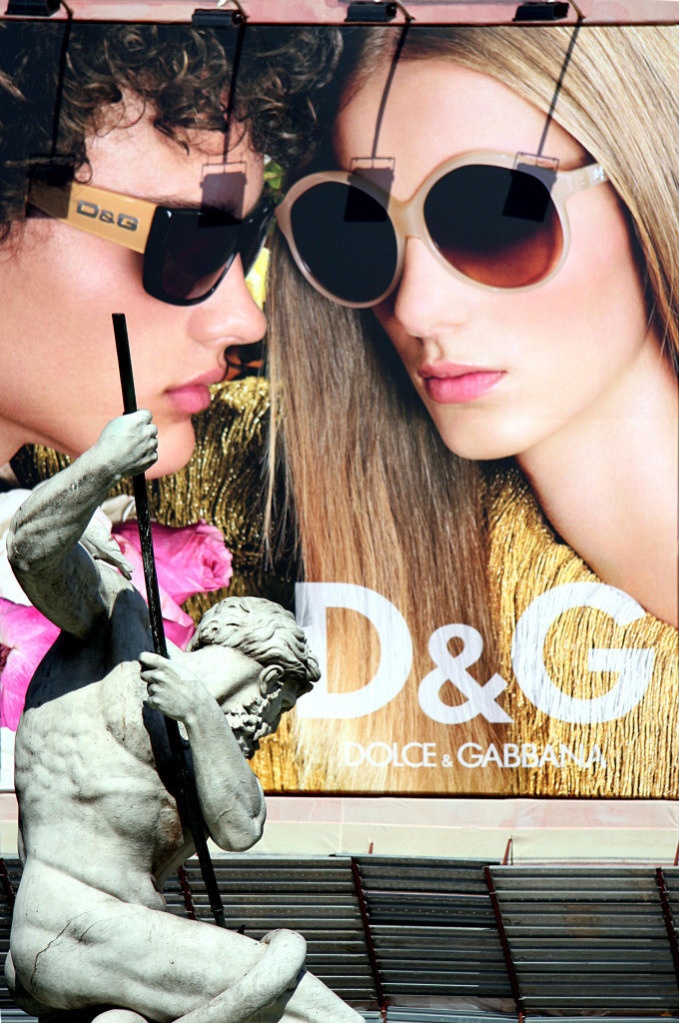L'antico abitante della piazza si difende come può (certo, avrei potuto divelvere la statua per far puntare la lancia contro il manifesto, ma la piazza era piena di gente e la cosa era troppo complicata ).
