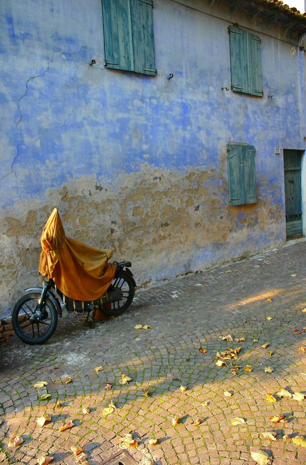 Il motorino messo a riposo e protetto alla bell'e meglio con il telo, le foglie sul pavimento pavè, il casolare con i colori tenue e consunti della sua facciata nell'ora del pre-tramonto conferiscono all'immagine davvero una sensazione ottobrina che preannuncia l'autunno.