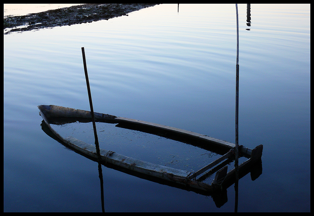 Dalla anteprima ci si aspetta di intravvedere una superficie liquida perfettamente immobile.... invece ci sono quelle lievi increspature, quel digradare dei blu... e, parer mio, qualla felice inclusione in diagonale di un triangolo di densa verità , di lieve disordine, che già l'acqua che ristagna entro il perimetro della barca annunciava, a sganciare il tutto da una semplice immagine compiacente, tranquillizzante.. solo registrata, per aprirsi ad una interpretazione ad una scelta precisa paesaggistica.