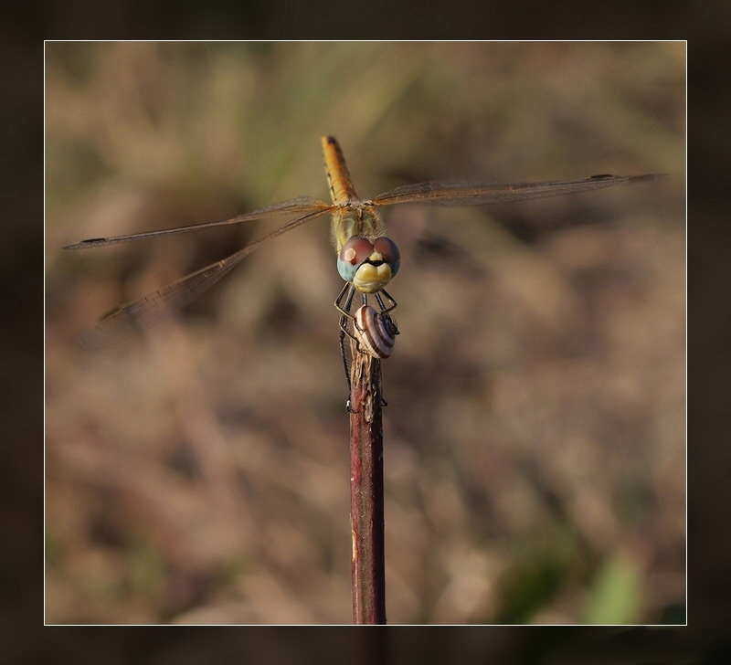 Una libellula che tenta di rapire un chiocciola non l'avevo mai vista!
