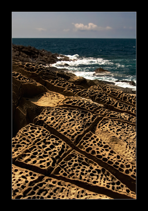 particolarissima l'erosione di questi scogli, ottima la composizione che sfrutta le linee tese della roccia che richiamano la linea dell'orizzonte.