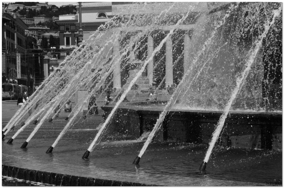 Ti dirò: la scelta dell'inquadratura non mi convince moltissimo.. per la presenza, sulla sinistra, di un epzzo di città e di elementi che distolgono un po' dall'attenzione richiesta dalla fontana e dai guizzi d'acqua.. e avrei magari giochicchiato un po' con il taglio della vasca della fontana in basso, per farlo finire, magari, nella parte dell'angolo in basso a destra..