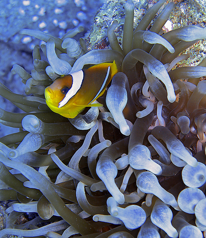 Nitidezza e colori davvero stupendi, la dominante ci sta, anzi apprezzo il contrasto cromatico fra la tonalità azzurrina dell'anemone ed i colori caldi e sgargianti del pagliaccio.