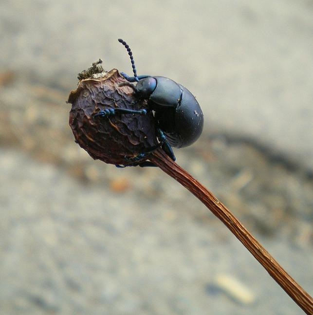 Lo scarrafon è una timarca tenebricosa. Il soggetto ed il posatoio scuri e quasi monocolori permettono poco la visibilità pur nello sfondo chiaro. Avresti dovuto cercare un angolo di ripresa che valorizzava maggiormente il soggetto.