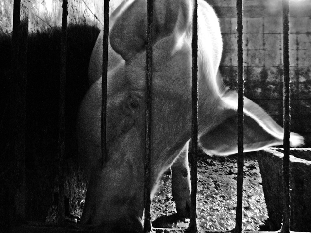 mi piace moltissima la seconda st1 dove il suino esce dall'ombra, anche la prima mi piace, resa drammatica salla presenza delle sbarre e dalla forte luce proveniente da dietro.
