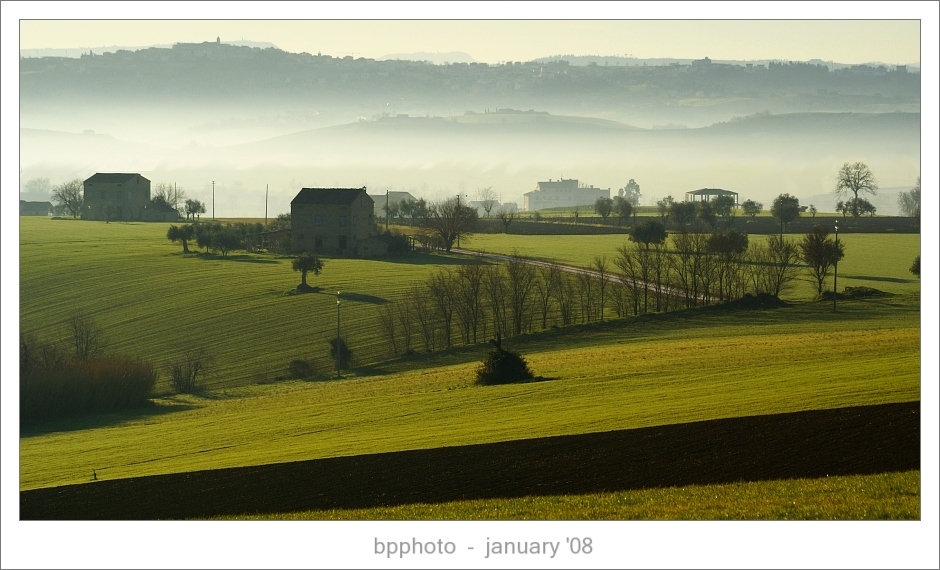 Molto bella , mi piacciono sia la luce in primo piano che la nebbia che avvolge le colline, in secondo piano.