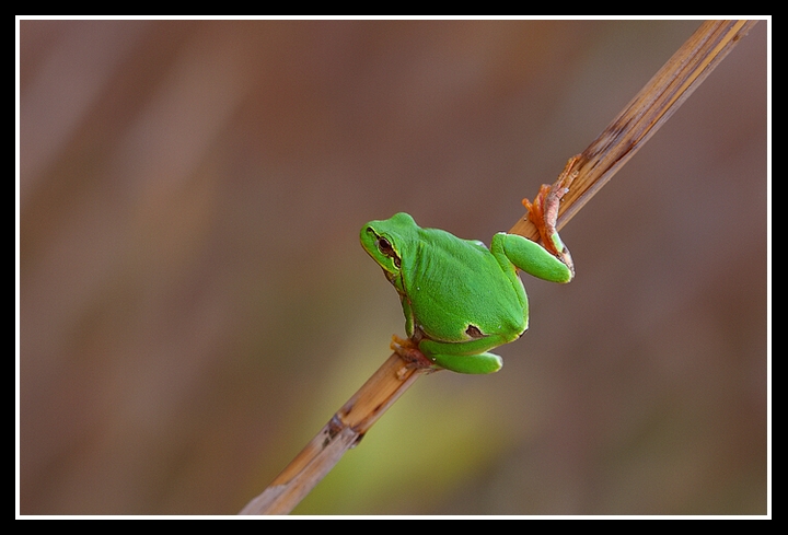 La raganella esce molto bene dallo sfondo leggermente variegato e sfocato. Sembra che il soggetto si sia accorto della tua presenza ed abbia girato la testa però non a sufficienza per evidenziare compiutamente l'occhio. Concordo con Mr.T per la dinamicità dell'immagine. Bello il verde.