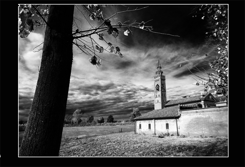 assolutamente bello scatto!gran bn, inquadratura ottima con l'albero che parte dall'angolo e la chiesa a metà lato, il cielo incorniciato dalle foglie...ottimo cielo, grande.