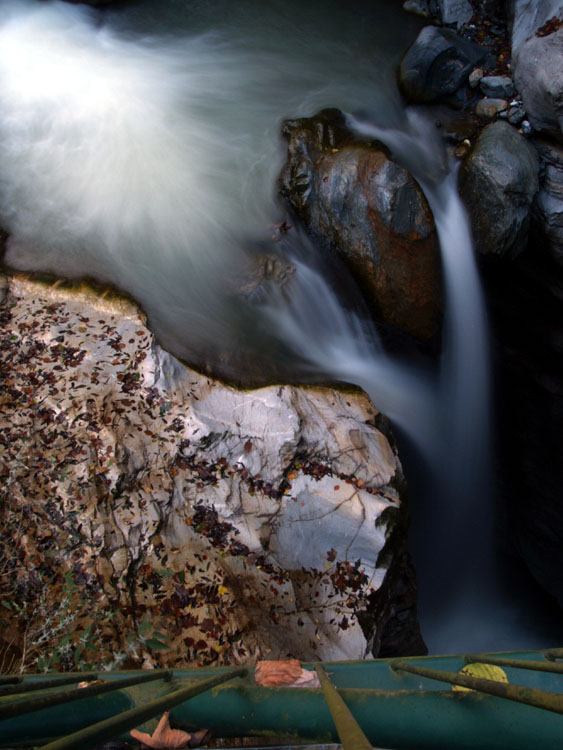 il torrente a tempi lunghi è un soggetto sempre valido, ma quoto le critiche alla ringhiera (da escludere assolutamente, non aggiunge nulla allo scatto da questa angolazione) e all'acqua bruciata (anche se solo lievemente).