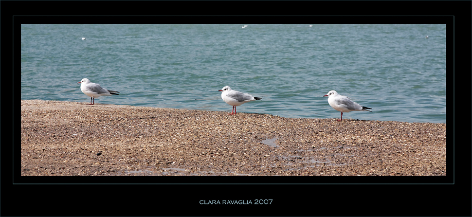 Mi piace molto l'essenzialità di questo scatto, terra e mare suddivisi con sapienza compositiva, i gabbiani in formazione quasi militaresca.