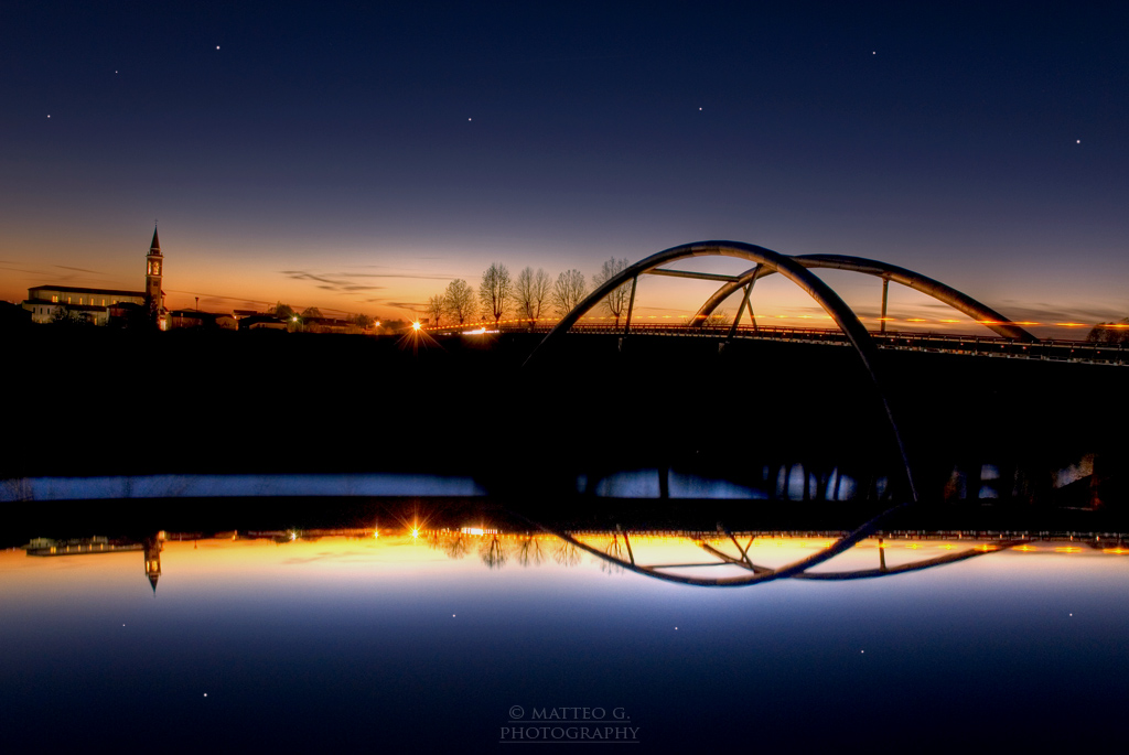 Bella, mi piace...forse il campanile (che la distorsione fa sembrare storto) è un po' di troppo: gli archi del ponte, gli alberi e le nuvole alla loro sinistra, secondo me, creavano già un bel gioco .