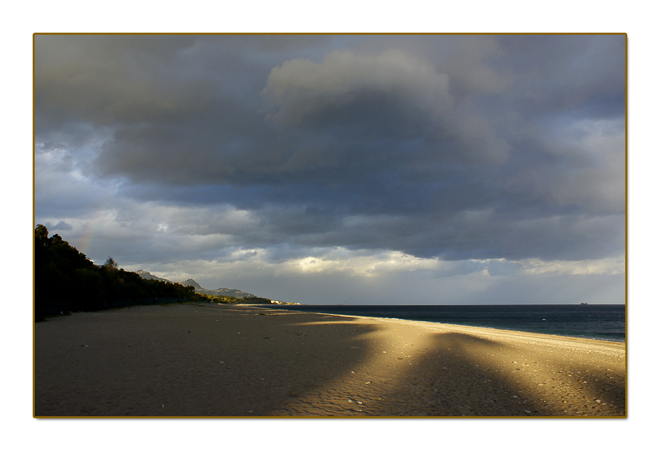Molto belle queste ombre che riempiono la spiaggia, molto affascinanti le tonalità. Una chicca l'accenno di arcobaleno.