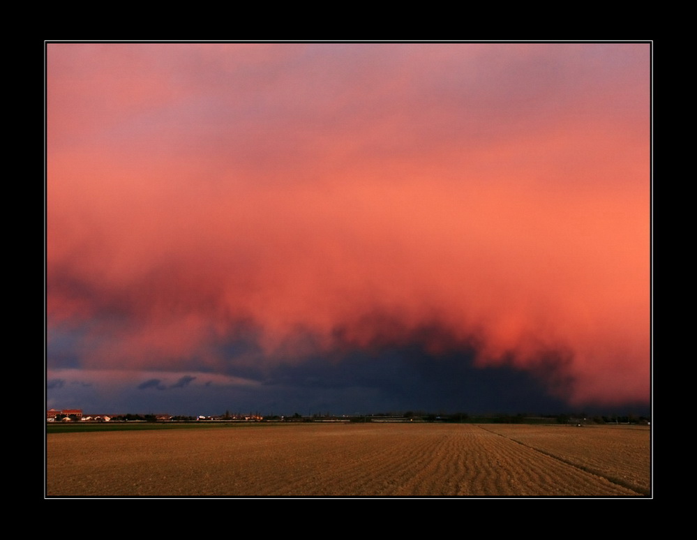 Dovvero impressionate questa nuvola arancione che sovrasta la campagna sottostante! Ottimo il distacco cromatico con il cielo blu scuro sullo sfondo!