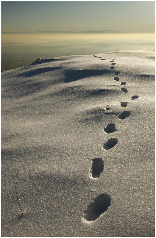 Bello il modo in cui la luce ancora bassa si deposita sull'innevato carezzandolo e come accentua la profondità delle impronte. Anche lo sfondo dove si intravede uj abitato mantiene una certa suggestività grazie alla presenza della nebbia che si colora di luce. Una buona immagine. Ciao Tiziano