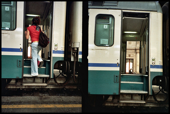 Mi piace il gioco che si innesca tra chi sale (partire...) e chi si allontana nella cornice dell'ingresso del vagone (tornare?).