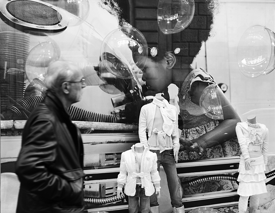In questa foto la struttura base di una foto street è quella classica e conosolidata che porta ad accostare elementi urbani a protagonisti in carne ed ossa. Qui l'accostamento principale riguarda la persona anziana, con la bambina sul cartellone .. mi sembra un accostamento abbastanza esplicito; poi c'è tutto un fiorire di elementi "accessori" che movimentano la scena, introducono e rafforzano i percorsi di lettura. Ci sono gli elementi in plastica appesi che sembrano essere bolle, i manichini che intervengono nel dialogo tra i due. Io di interpretazioni soggettive non ne do mai, per deformazione mentale, ma ti posso garantire che il supporto visivo perchè si possano estrapolare agevolmente, dal mio punto di vista non manca. |
