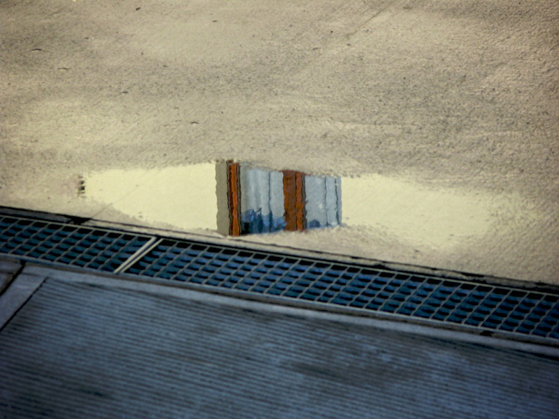Per la sfocatura, anche la fisica ha le sue leggi. La finestra riflessa e che si trovava a distanza perlomeno tripla da quella che era tra me e la pozzanghera è a fuoco, l'increspatura dell'acqua purtroppo ne rende il riflesso meno nitido, ed anche mosso.