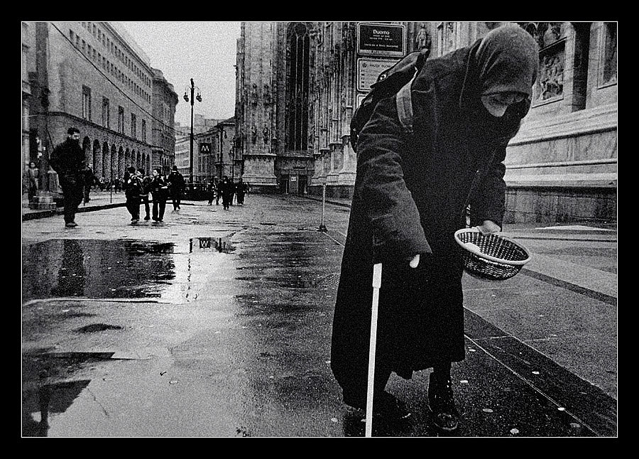 Venendo alla foto: lo trovo uno scatto discreto, il cui limite sta nel fatto di riproporre per la milionesima volta un tema già visto: il mendicante, il povero, il diseredato, fra i passanti. Uno scatto "facile" perchè il soggetto è debole e indifeso.