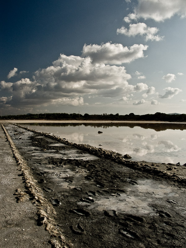 quelle orme nere che creano una diagonale ubriachissima, che noterai girare attorno alla pozzanghera per dirigersi idealmente nell'angolo destro, le trovo essenziali per evidenziare il nero del limo, e non solo.