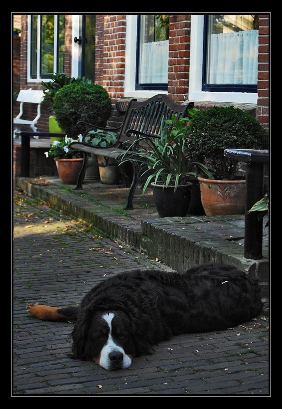 Prima cosa complimenti per il cagnone, è simpaticissimo. Bella immagine il cane sembra a riposo ma non lo è. Belle le luci tenui. Ciao.