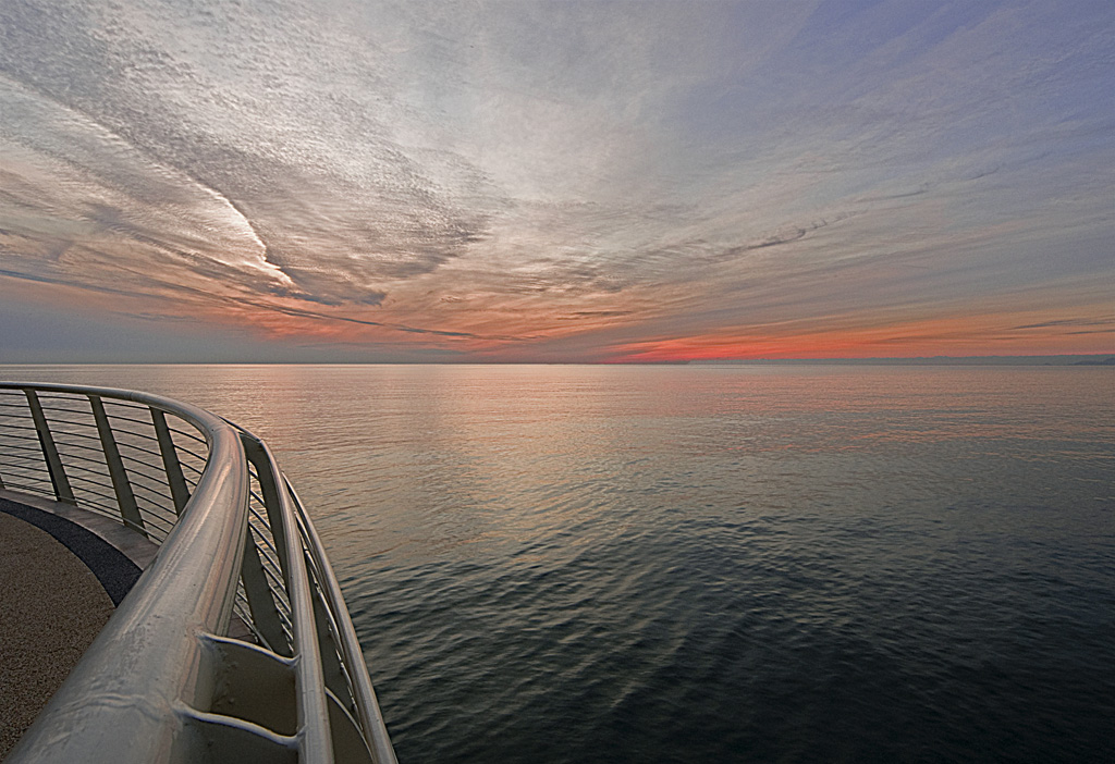 Hai colto un cielo e un mare stupendi, e il parapetto curvo della nave dà un buon primo piano. Molto ben realizzata. Soffre un po' di una mancanza di un preciso punto di imteresse (ci fosse stata la silhourtte di una nave poco sotto l'orizzonte, circa ai 2/3 dell'immagine partendo da sinistra, o un gabbiano nel cielo, sempre sulla destra, sarebbe stato magnifico); ma non potevi farci niente e rinunciare a riprendere quello che hai ripreso sarebbe stato un delitto.